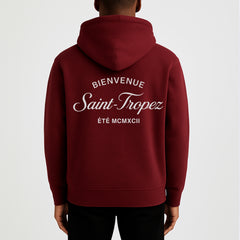 Inspired by coastal elegance, this black hoodie features refined Saint-Tropez typography that adds a sophisticated edge. Crafted with a smooth, heavyweight fleece, it delivers comfort with a premium finish.